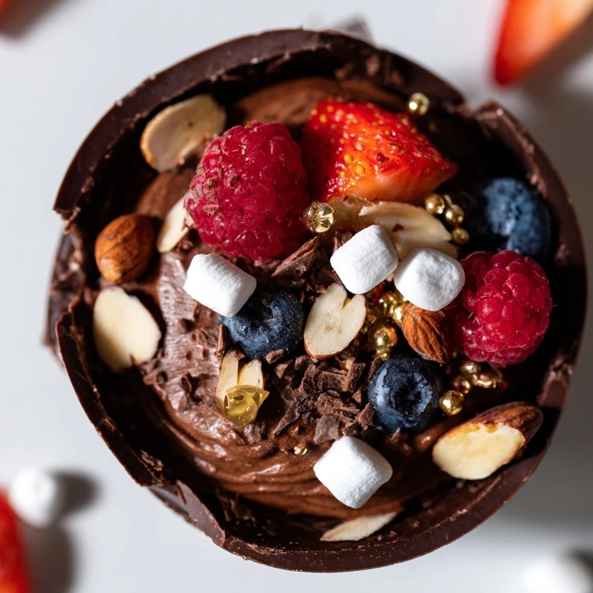 Prepare chocolate cups and mousse up to 24 hours in advance. Store cups separately at room temperature in an airtight container. Keep mousse refrigerated. Assemble with toppings just before serving for optimal texture and appearance.