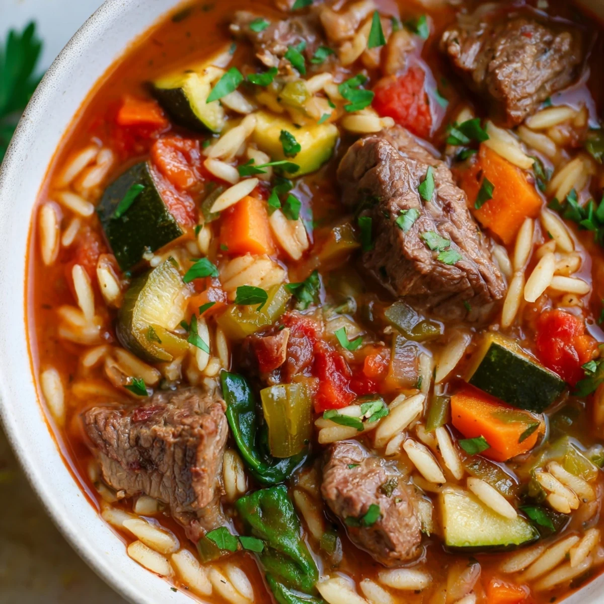This satisfying soup combines tender chunks of beef stew meat with orzo pasta and a colorful medley of garden vegetables. The savory broth develops deep flavor as everything simmers together, creating a filling meal that's perfect for chilly evenings.