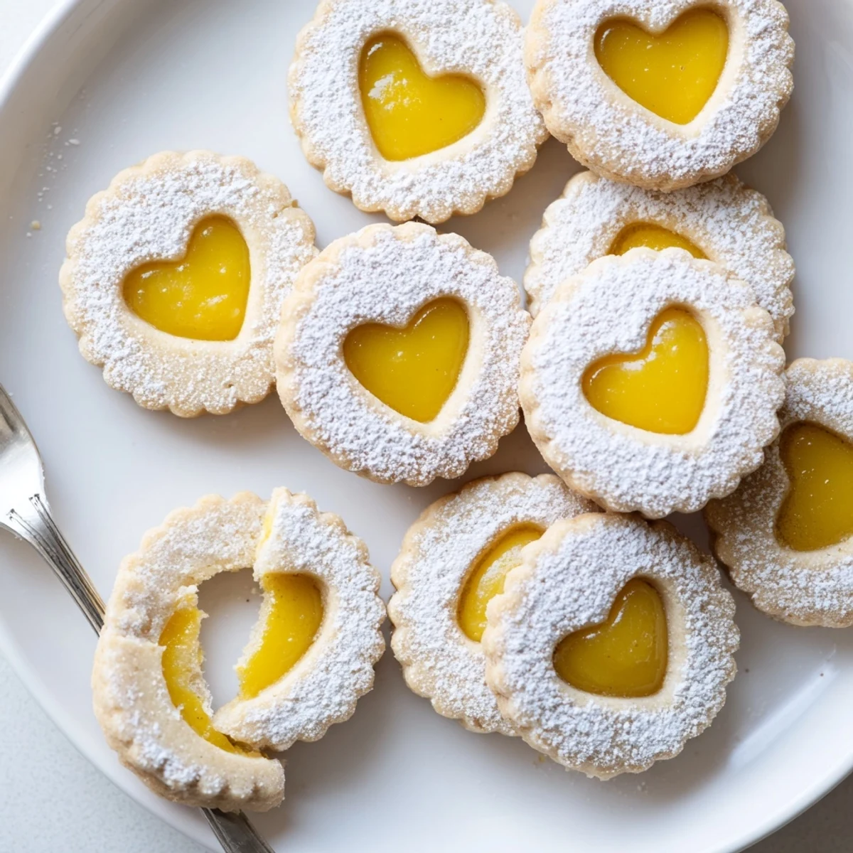 These delicate sandwich cookies feature buttery almond shortbread spiced with cinnamon, filled with vibrant Meyer lemon curd. The combination of nutty, buttery dough and bright, tangy citrus creates a sophisticated balance of flavors. Each cookie showcases a charming window revealing the golden lemon filling beneath a dusting of powdered sugar.